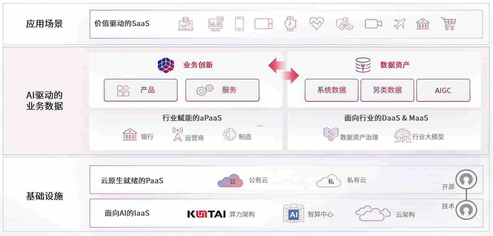 数字时代,,,,围绕企业数字化转型的关键要素,,,拉菲2平台数码开创性的提出数云融合战略和技术体系框架,,,,着力在云原生、、、数字原生、、、AI原生和信创产业上架构产品和服务能力,,,为处在不同数字化转型阶段的快消零售、、、汽车、、金融、、、医疗、、政企、、、教育、、运营商等行业客户提供泛在的敏捷IT能力和融合的数据驱动能力,,,构建跨界融合创新的数字业务场景和新业务模式,,,,助力企业级客户建立面向未来的核心能力和竞争优势,,,全面推动社会的数字化、、智能化转型升级。。。。